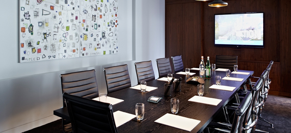 Our high-specification boardroom can seat 12 people and is perfect for formal board meetings or private dining for up to 12 people. This room features a 60” HD screen, audio-conferencing and unique pieces of contemporary art.
